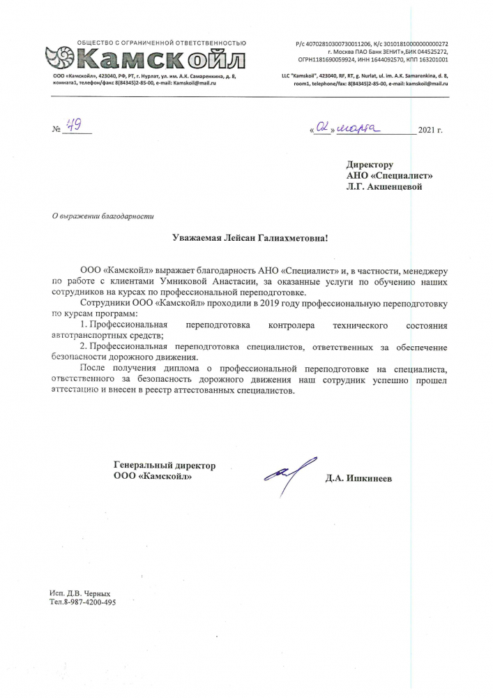 ООО "Камскойл" выражает благодарность АНО "Специалист" и, в частности, менеджеру по работе с клиентами Умниковой Анастасии, за оказанные услуги по обучению наших сотрудников на курсах по профессиональной переподготовке.
